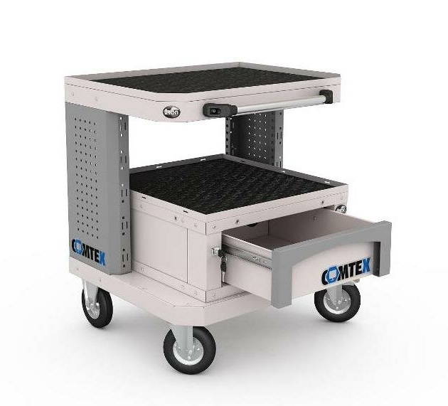 В комплектацию тележки Comtex №3 входит: тележка Comtex с колесами и ручкой, тумба малая Comtex 1, лоток 500х540 для тумбы Comtex, лоток 630х480 для тележки Comtex. Стойки тележки имеют телескопическую конструкцию, что позволяет изменить высоту стойки от 442 до 842 мм с шагом 44,45 мм. Тумба малая Comtex 1 комплектуется одним выдвижным ящиком, который закрывается ключевым замком. Сверху на тележке Сomtex и на тумбе малая Comtex 1 установлен лоток с маслобензостойкий ковриком. На задней стенке тележки предусмотрены кабелепроводы и вентиляционные отверстия. Ручку для перемещения тележки возможно устанавливать с двух сторон. Колеса полиуретановые диметром 125 мм (2 неповоротных, 1 поворотное, 1 поворотное с тормозом). Цвет: серый Ral 7035, стойки тележки - темно-серые Ral 7046. Тележка поставляется в собранном виде
