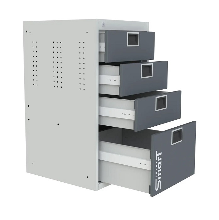 В комплектацию верстака входит: столешница 1760 SMART, тумба SMART 4, тумба SMART 1-1, тумба-пенал SMART, ящик подвесной Smart-1, один перфорированный экран SMART 1760, комплект косынок для экрана SMART. Столешница выполнена из фанеры 27 мм со стальной окрашенной накладкой 1,2 мм. Тумба SMART 1-1 комплектуется одной дверью, одним выдвижным ящиком. Тумба SMART-4 комплектуется 4 выдвижными ящиками. Выдвижные ящики оборудованы телескопической системой полного выдвижения ящиков с фиксацией в закрытом состоянии (50000 циклов). Тумба-пенал SMART выдвигается на четырех телескопических направляющих и предназначена для хранения крупногабаритных инструментов и аксессуаров. Ящик подвесной Smart-1 прикручивается под столешницу верстака. Все тумбы закрываются ключевым цилиндровым замком. Секретность замка 2000 комбинаций (2 ключа в комплекте). Внутренние стенки дверей и перфорированный экран имеют универсальную перфорацию для размещения навесных элементов. Шаг квадратной перфорации (10 мм) - 38х38 мм, круглой (7 мм) - 25х38 мм. Возможна смена стороны открывания двери тумбы. Цвет верстака: корпус тумб - серый Ral 7035, столешница, двери тумб, лицевая панель ящиков - антрацит Ral 7016. Поставляется в разобранном виде.