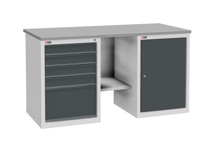 Цвет верстака: серый Ral 7038, лицевая панель ящиков/дверей антрацит Ral 7016. Тип покрытия: эпоксидная порошковая краска. Поставляется в разобранном виде