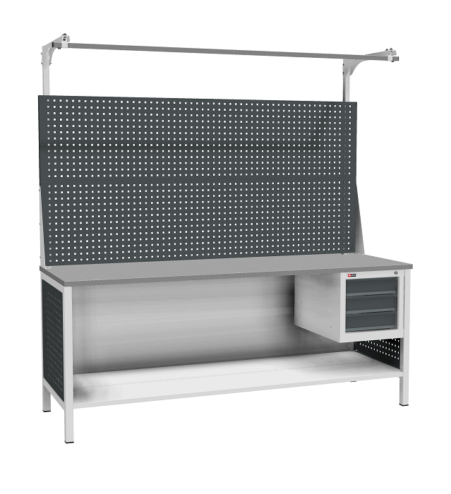 В комплектацию верстака входит: столешница ВЛ-К 200, две опоры ВЛ-К, подвесная тумба ВЛ-К-003, четыре промежуточные панели ВЛ-К, панель облицовочная к опоре ВЛ-К, два перфорированных экрана.